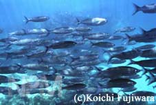 ガラパゴスにはサンゴ礁がないが、海はたくさんの魚を養っている。諸島を流れる冷たい海流や湧昇流、それに熱帯の暖流が入り交じって、大量のプランクトンを育て、海を豊かにしている。海水温は冷たい時で16℃、暖かい時は29℃にもなるが、これは年間を通して時期も場所も異なる。このような温度差は、ガラパゴスの海に温帯性と熱帯性の魚の混在を許している。 |
