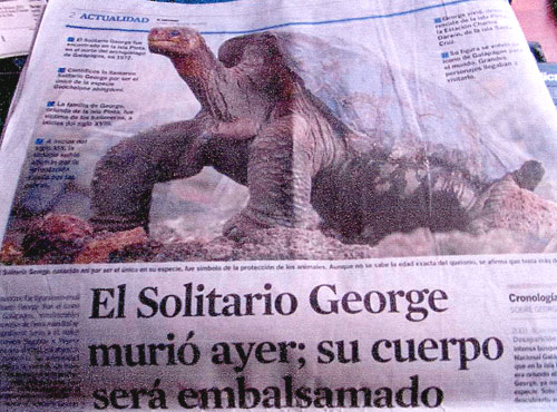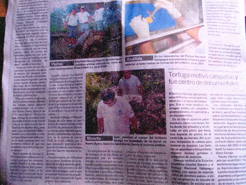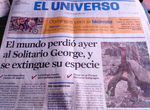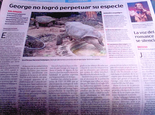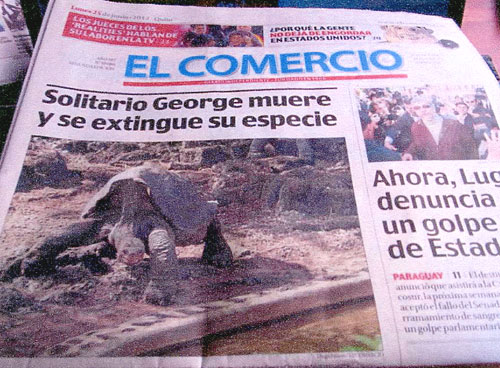 大手新聞社3社( El UNIVERSO, El COMERCIO, ECUADORINMEDIO)によって一面、次ページに中開き半面とで大きく取り上げられ、他の新聞社でも大きく紙面に載っています。また、どの新聞社もロンサムジョージを失った事、またひとつのガラパゴスゾウガメの種が失われた事、そしてエクアドルに取って最も大切なものの一つを失ったという報道がなされています