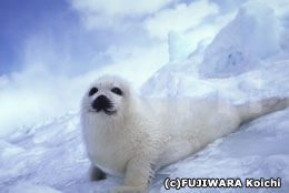 氷の上に、まっ白なタテゴトアザラシのあかちゃんが