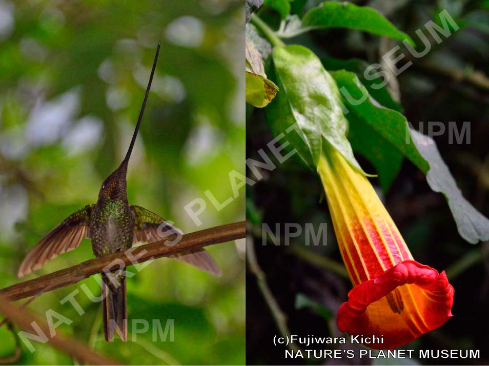 長いくちばしを持つヤリハシハチドリは、同じくらい長い花をつけるベニバナチョウセンアザガオと共進化の関係です。