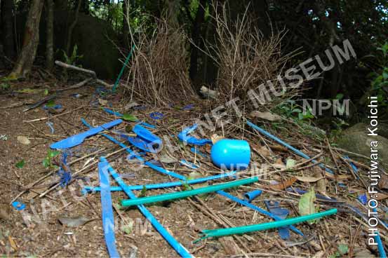 A male of Satin Bowerbird collect only blue plastic to make a specialized
