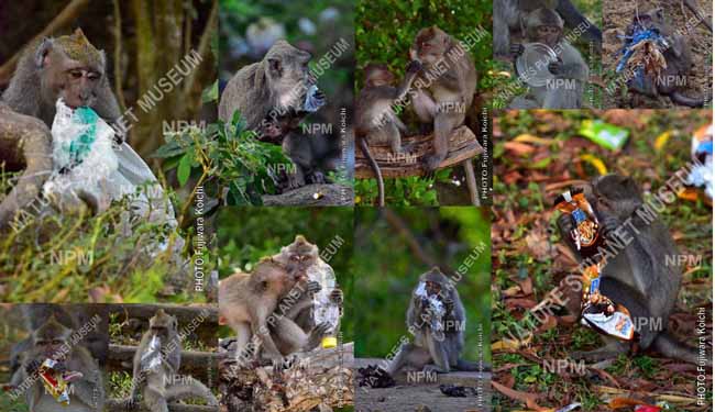 Wild monkeys eat plastic trash
