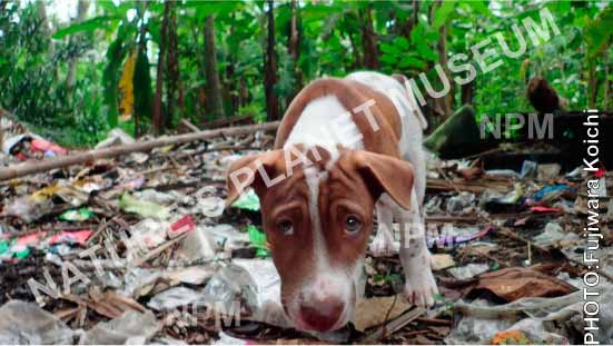 プラスチックごみであふれたバナナプランテーションをねぐらにしている、野良犬。 |