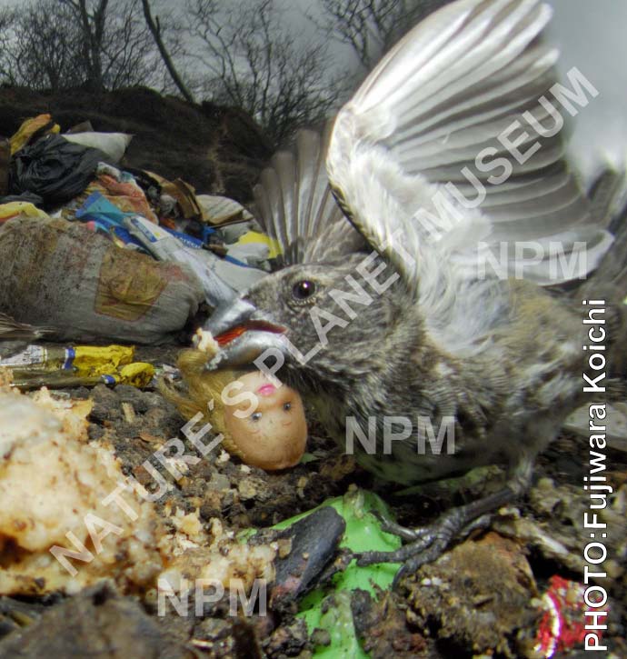 南米ガラパゴス諸島にある、分別されずに、ただ森の中に捨てられているゴミの山。人間がすてた残飯を食べにやってきたダーウィンフィンチ。膨大なプラスチックゴミも一緒に捨てられている。