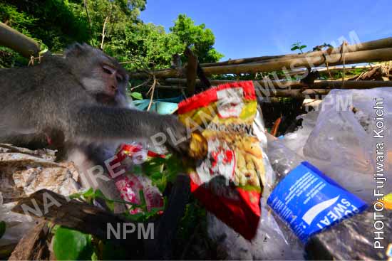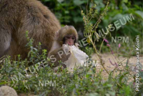 日本でも、ニホンザルがプラスチック袋を食べている姿を発見。 |
