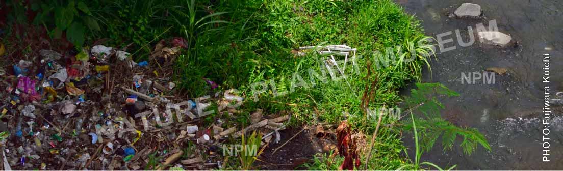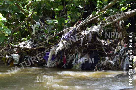 森と同じように、川岸にもたくさんのプラスチックごみが。森に捨てられたごみが、風に飛ばされたり、雨に流されたりしてたまったものだ。