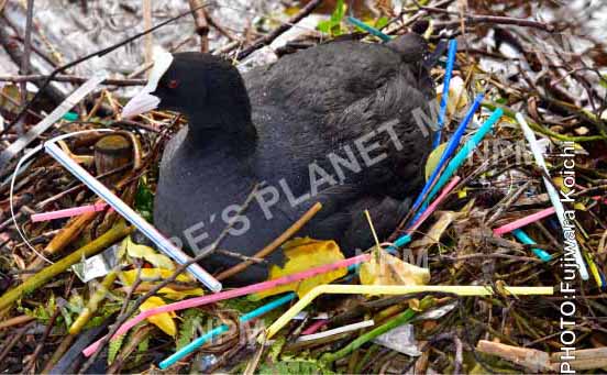 ストローで巣作りする野鳥