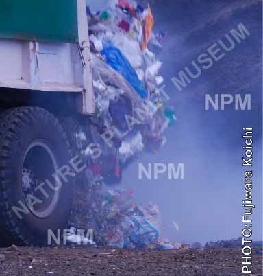 地響きのような大きな音とともに、トラックの荷台からたくさんのごみが捨てられている。 |