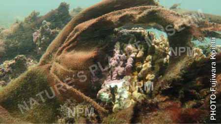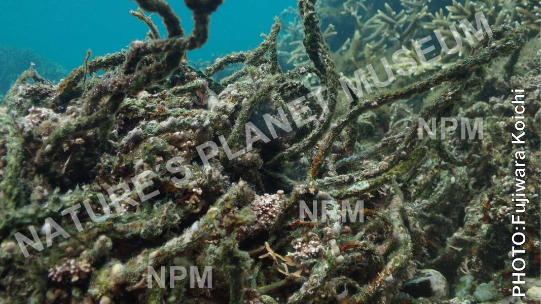 レジ袋がからみついたサンゴ。レジ袋がふれている部分が黒くなって、サンゴが死にはじめている。