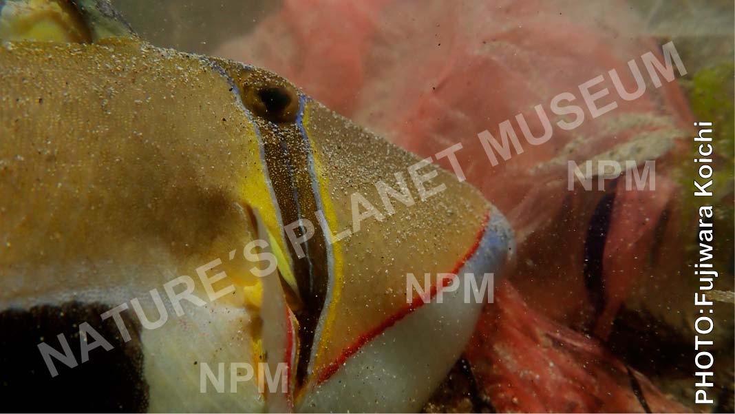 プラスチック袋についた藻をプラスチックと一緒に食べてしまうクラカケモンガラ。