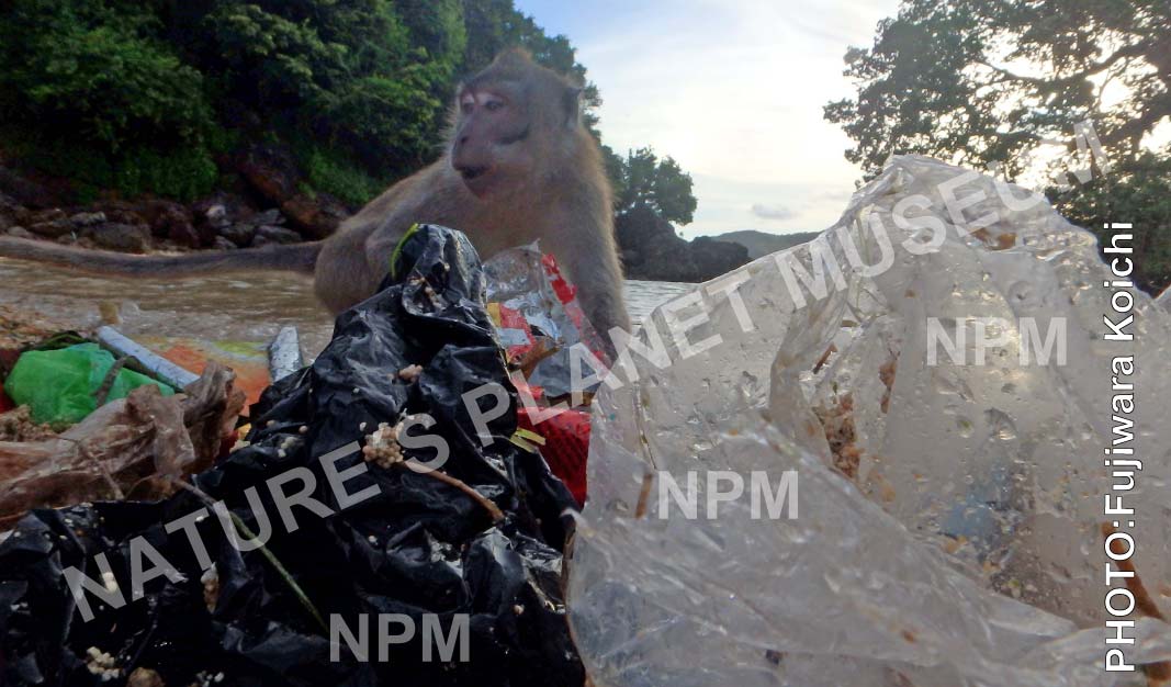 海中のレジ袋に触れて、海からあわてて飛び出してきたサル。
