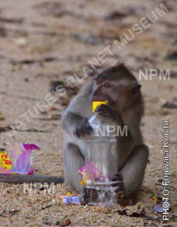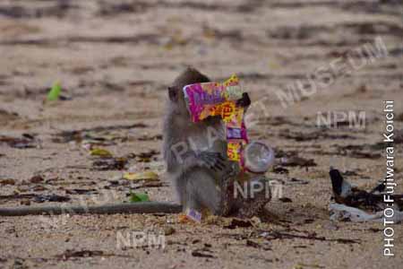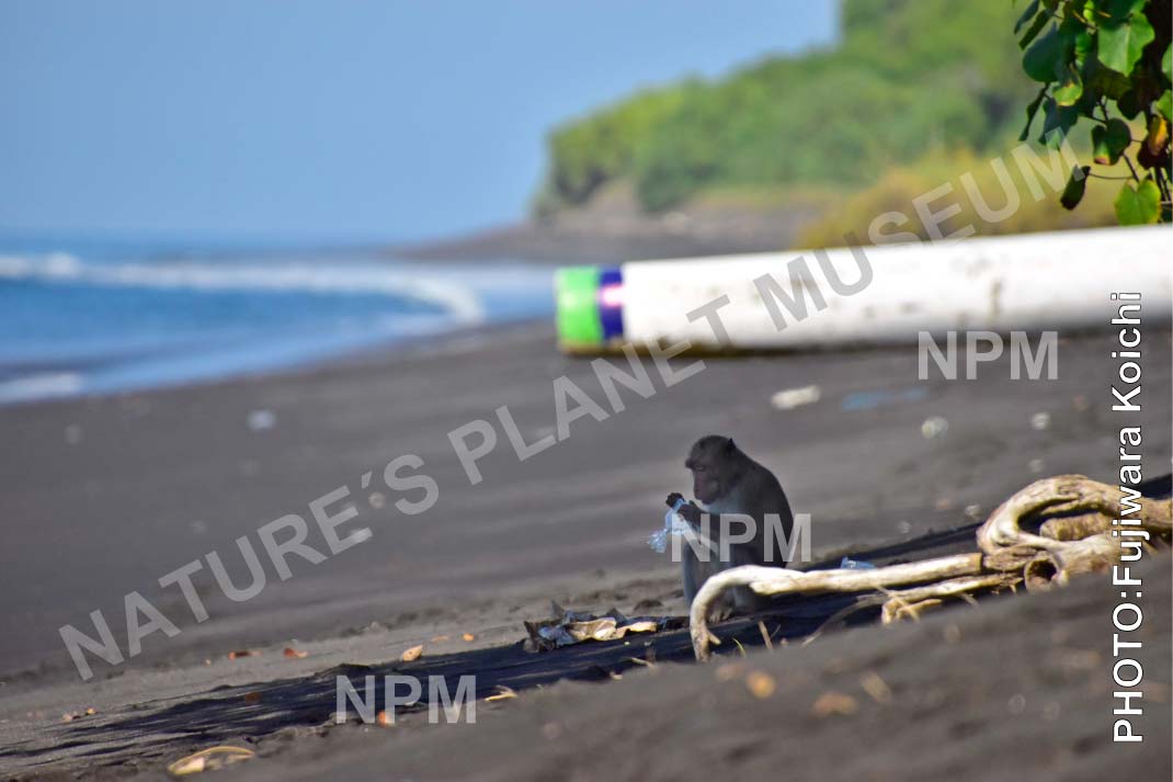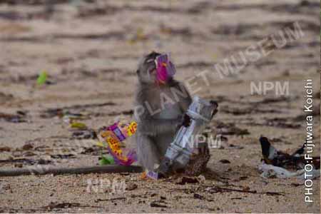 はらぺこのサルが、砂浜に落ちていたペットボトルをかじりはじめた。ペットボトルのいろいろなところにかみついて、食べられるのか味見をしているのだ。