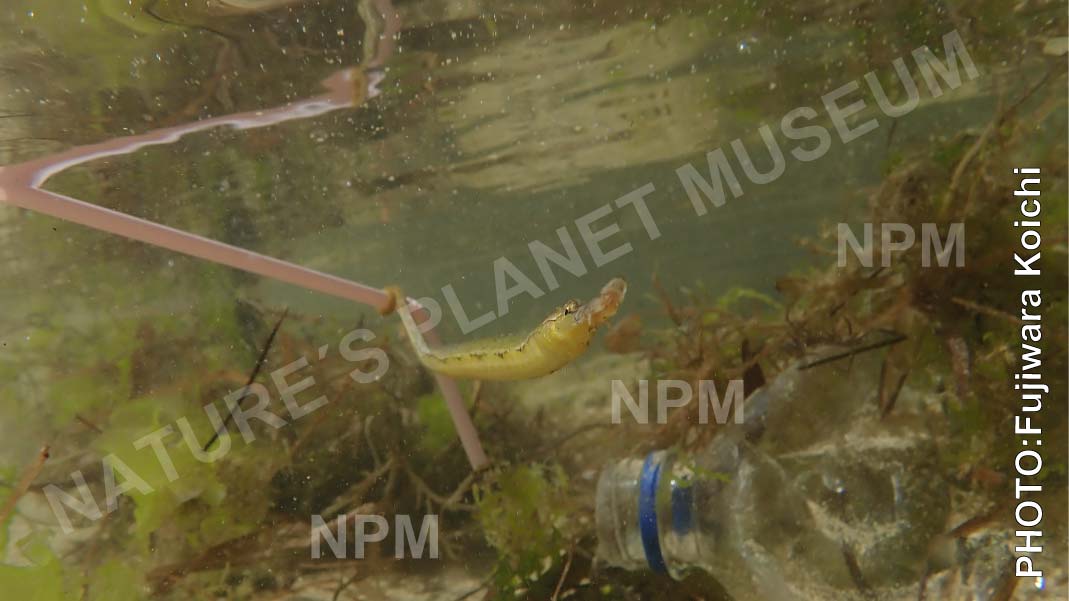 ヨウジウオが海に捨てられたストローに尾びれをからませていた。
