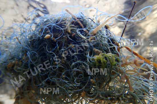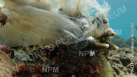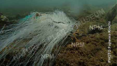 釣り糸であるプラスチック製のテグスが海底にたくさん捨てられている。