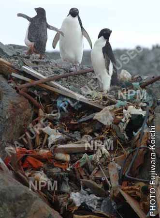 huge amount of waste with plastic material and other waste dumped in the penguin