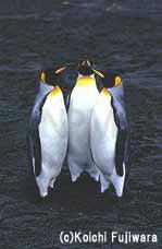 一見、井戸端会議ふう。実は、フリッパー(翼)とくちばしを上げ、相手ににらみをきかせているらしい