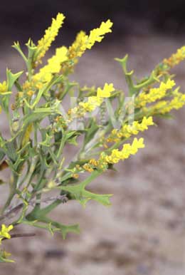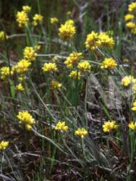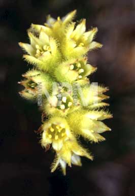 葉のない20cm程の房に、1cm弱の黄色い球状の花をつける。