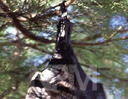 後ろ脚で、葉や木の枝にぶら下がっている。